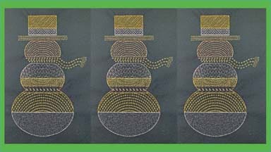 The project this Month is Winter in July with a Snow Person. There are five single-hooping sizes and two multiple-hooping sizes from 4” x 6 ¾” to 13 ½” x 22 ¼”. The smaller sizes are great for apparel. The larger sizes make great Wall or Door Hangings. Combine small for Napkins and Large for Table Runners. These designs could also be used for quilting.